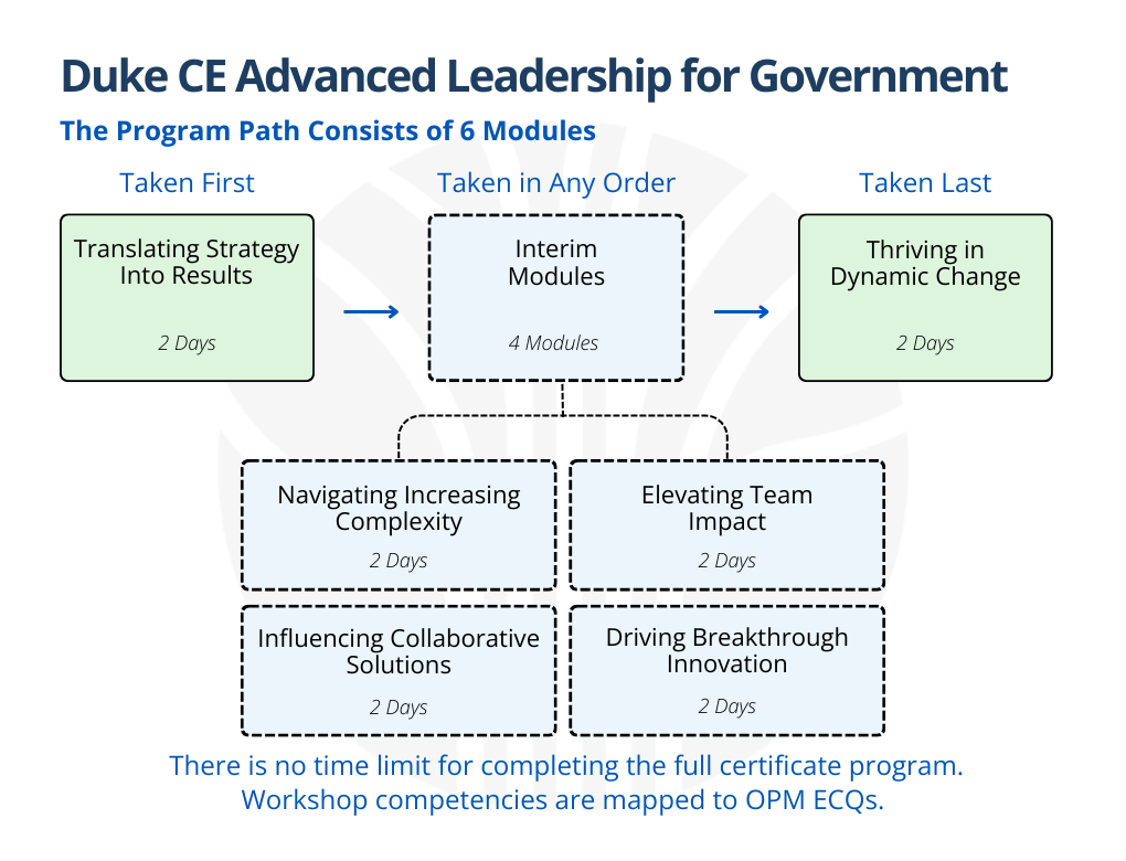 Participants must enroll in Translating Strategy into Results first and Thriving In Dynamic Change last. There is no time limit for completing the full certificate program. Workshop competencies are mapped to OPM ECQs.